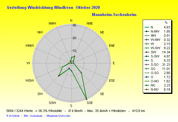 Der wärmste Tag war der 22.10.2020 um 15:50 mit 21.2°C. Am kältesten war es mit 3.6°C am 18.10.2020 um 08:15.