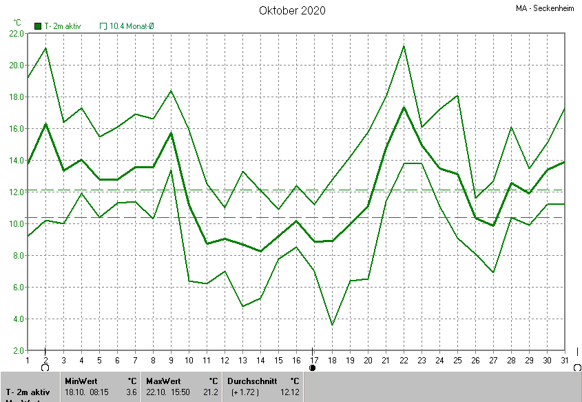 Die Durchschnittstemperatur für den Monat Oktober 2020 lag bei 12.12°C. Die Abweichung vom langjährigen Mittel war +1.72°C.