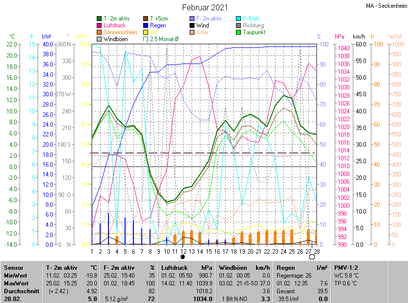 Die Durchschnittstemperatur für den Monat Februar 2021 lag bei 4.92°C. Die Abweichung vom langjährigen Mittel war +2.42°C.