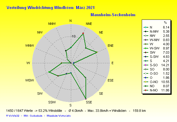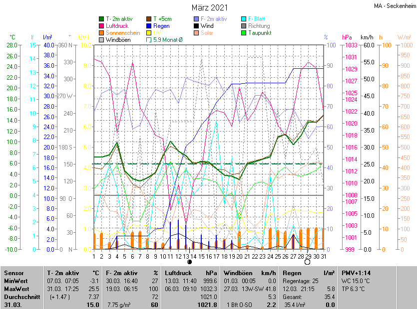 Die Durchschnittstemperatur für den Monat März 2021 lag bei 7.37°C. Die Abweichung vom langjährigen Mittel war +1.47°C.