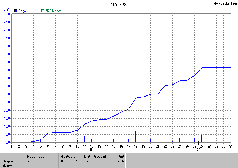 Die gesamte Regenmenge lag bei 46.6l/m² (entspricht: 62.1%) und war damit um -28.4l/m² vom langjährigen Wert entfernt. Niederschlag gab es an 22Tagen. Mehr als 2mm Regen gab es an 8Tagen. Sehr viel Regen mit mehr als 20mm pro Tag gab es an 0Tagen.