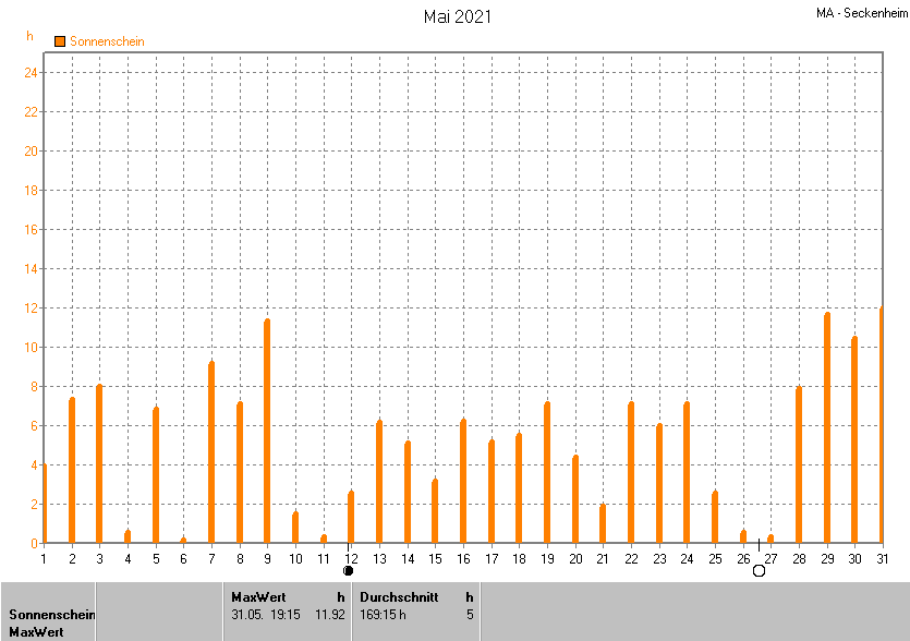 Dargestellt wird die grafische Übersicht für die Sonnenscheinzeit. Zu sehen sind immer die täglichen Sonnenstunden (von 0-24 Uhr):