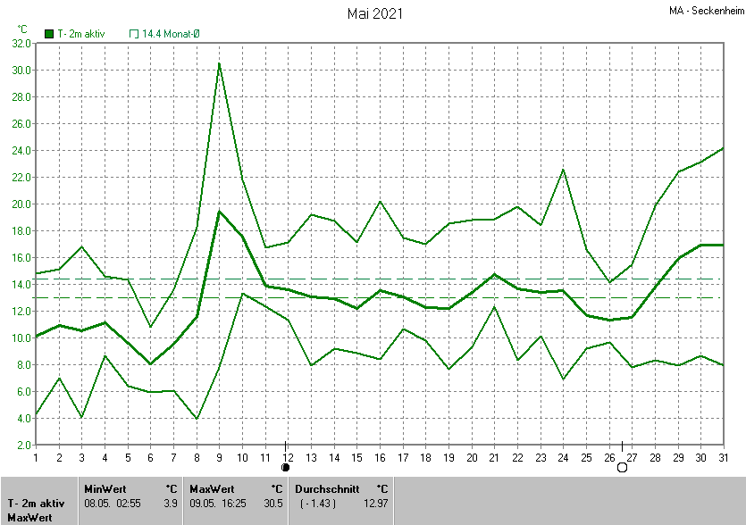 Die Durchschnittstemperatur für den Monat Mai 2021 lag bei 12.97°C. Die Abweichung vom langjährigen Mittel war -1.43°C.