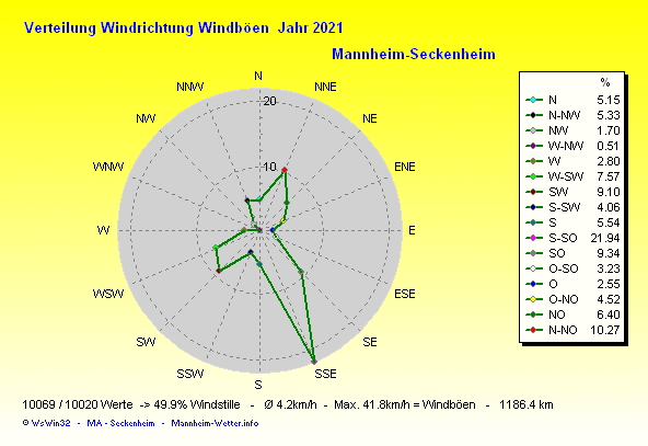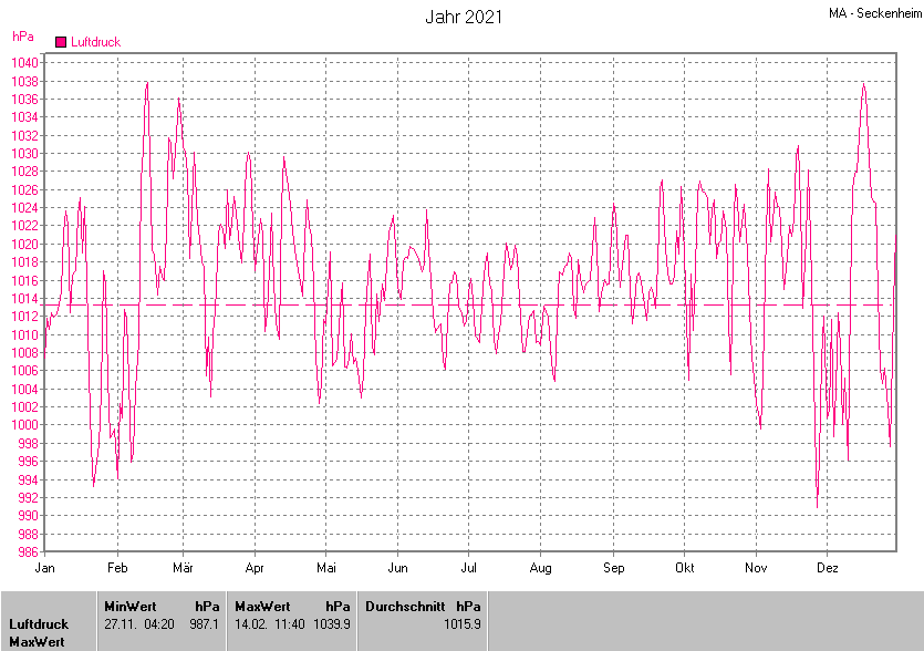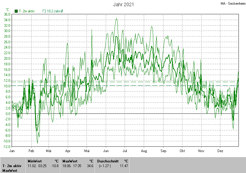 Die Durchschnittstemperatur für das Jahr 2021 lag bei 11.47°C. Die Abweichung vom langjährigen Mittel war +1.27°C.