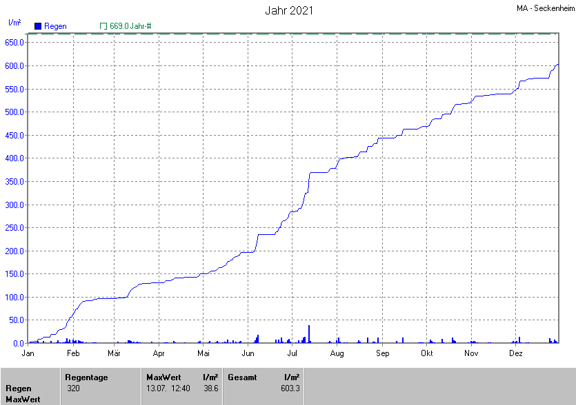Die gesamte Regenmenge lag bei 603.3l/m² ( 90.2%) und war damit um -65.7l/m² vom langjährigen Wert entfernt. Niederschlag gab es an 201Tagen. Mehr als 2mm Regen gab es an 84Tagen. Sehr viel Regen mit mehr als 20mm pro Tag gab es an 1Tagen.