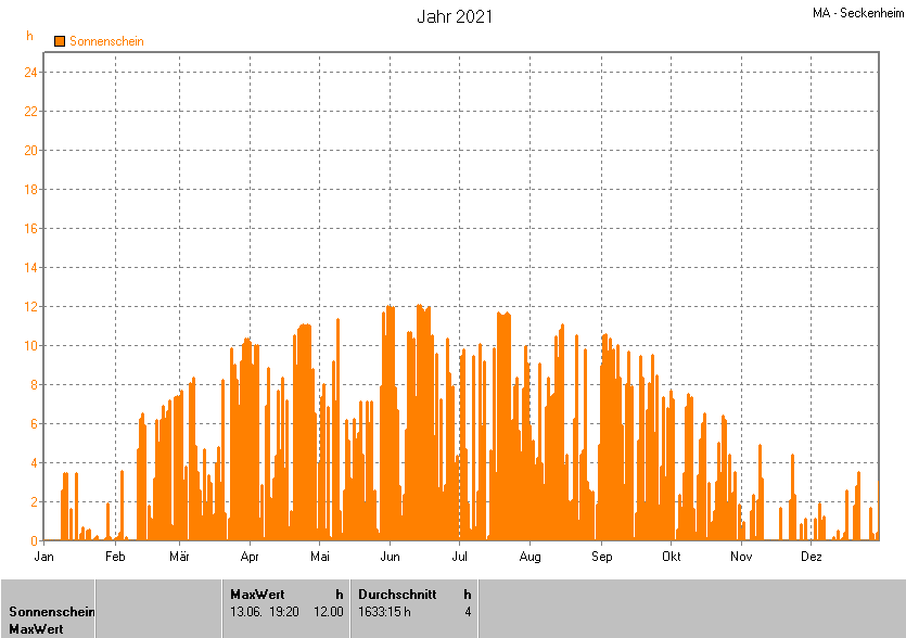 Dargestellt wird die grafische Übersicht für die Sonnenscheinzeit. Zu sehen sind immer die täglichen Zeiten (von 0-24 Uhr):