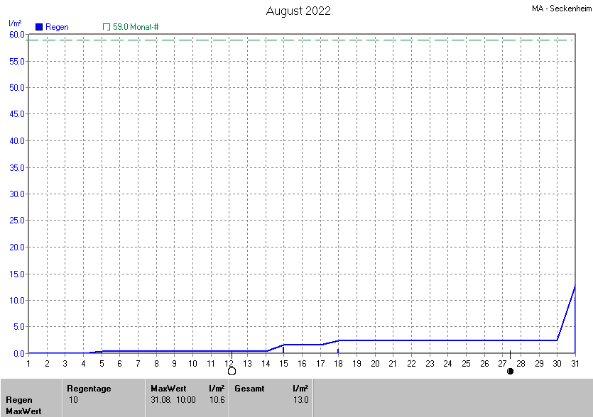 Die gesamte Regenmenge lag bei 13.0l/m² (entspricht: 22.0%) und war damit um -46.0l/m² vom langjährigen Wert entfernt. Niederschlag gab es an 4Tagen. Mehr als 2mm Regen gab es an 1Tagen. Sehr viel Regen mit mehr als 20mm pro Tag gab es an 0Tagen.