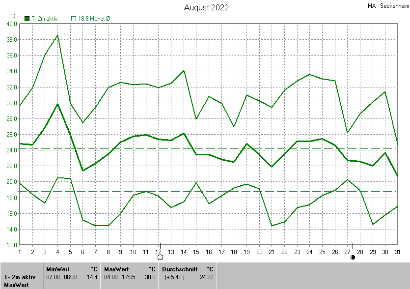 Der wärmste Tag war der 04.08.2022 um 17:05 mit 38.6°C. Am kältesten war es mit 14.4°C am 07.08.2022 um 06:30.