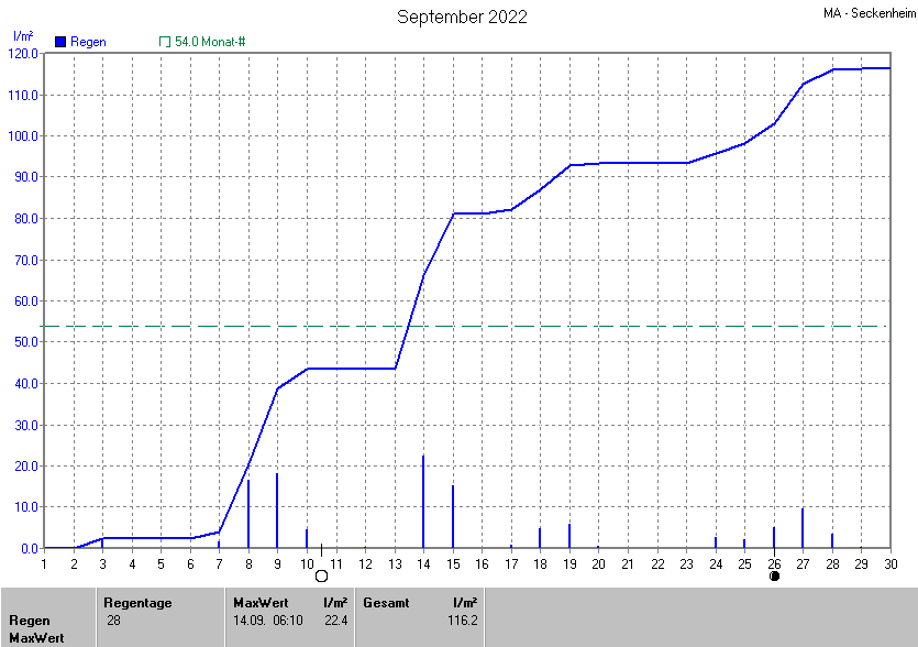 Die gesamte Regenmenge lag bei 116.2l/m² (entspricht: 215.2%) und war damit um +62.2l/m² vom langjährigen Wert entfernt. Niederschlag gab es an 18Tagen. Mehr als 2mm Regen gab es an 13Tagen. Sehr viel Regen mit mehr als 20mm pro Tag gab es an 1Tagen.