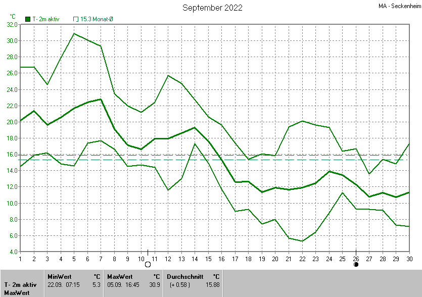 Der wärmste Tag war der 05.09.2022 um 16:45 mit 30.9°C. Am kältesten war es mit 5.3°C am 22.09.2022 um 07:15.