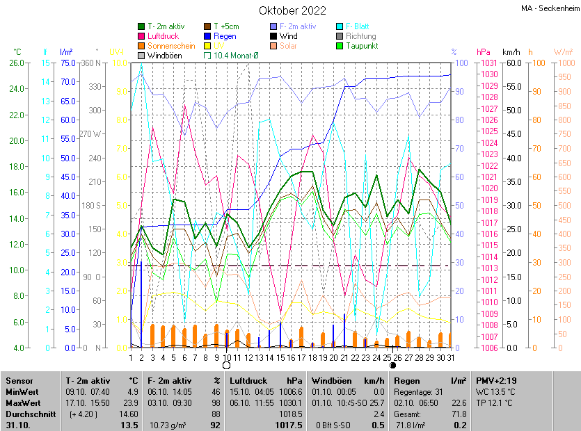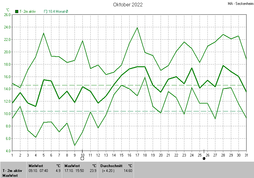 Die Durchschnittstemperatur für den Monat Oktober 2022 lag bei 14.59°C. Die Abweichung vom langjährigen Mittel war +4.19°C.