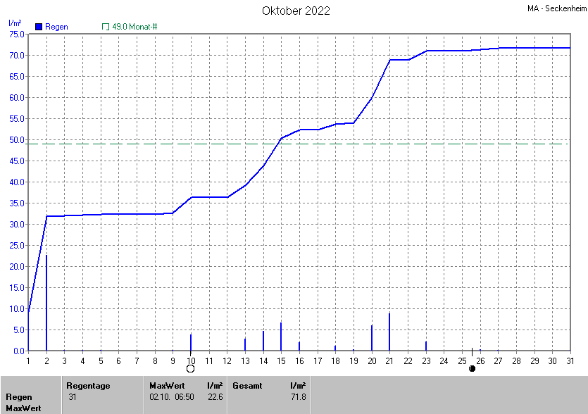 Die gesamte Regenmenge lag bei 71.8l/m² (entspricht: 146.5%) und war damit um +22.8l/m² vom langjährigen Wert entfernt. Niederschlag gab es an 19Tagen. Mehr als 2mm Regen gab es an 9Tagen. Sehr viel Regen mit mehr als 20mm pro Tag gab es an 1Tagen.