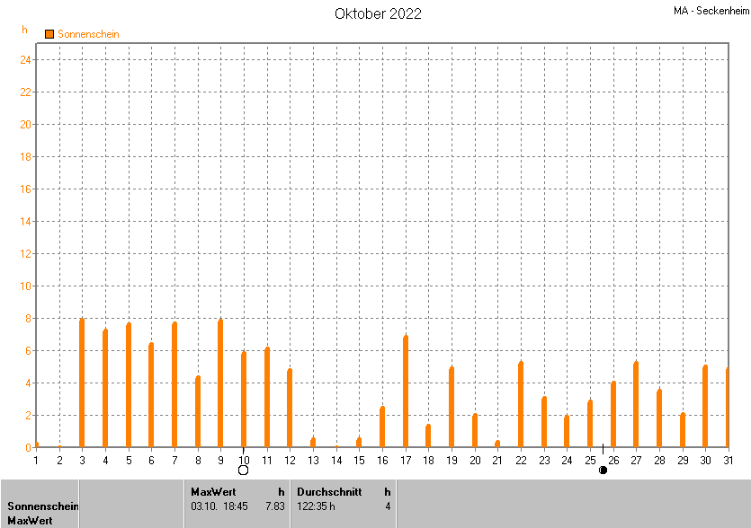 Dargestellt wird die grafische Übersicht für die Sonnenscheinzeit. Zu sehen sind immer die täglichen Sonnenstunden (von 0-24 Uhr):