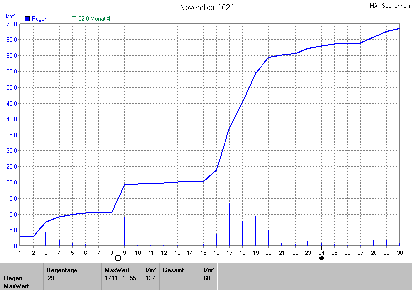 Dargestellt wird die grafische Übersicht für den Niederschlag. Zu sehen sind immer die täglichen Niederschlagsmengen (von 0-24 Uhr) und in der ansteigenden Linie die Summe aller Niederschläge: