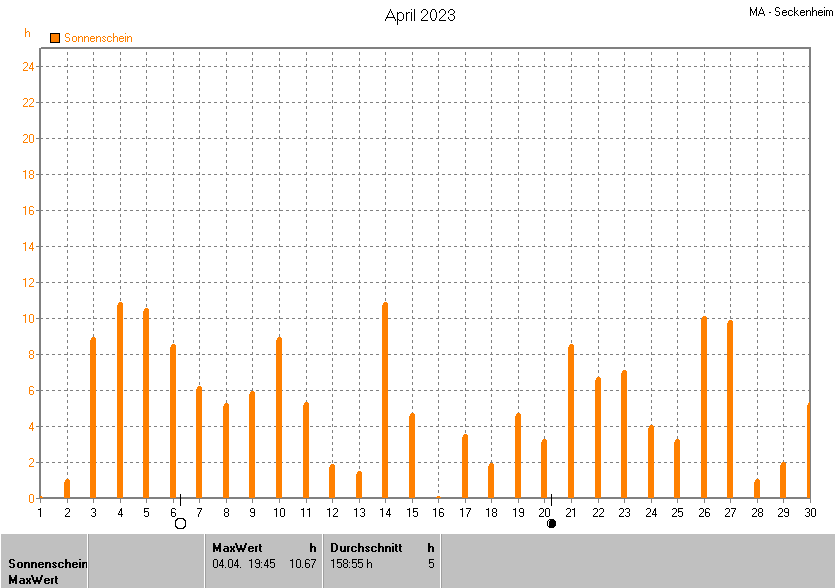 Dargestellt wird die grafische Übersicht für die Sonnenscheinzeit. Zu sehen sind immer die täglichen Sonnenstunden (von 0-24 Uhr):