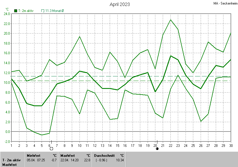Die Durchschnittstemperatur für den Monat April 2023 lag bei 10.34°C. Die Abweichung vom langjährigen Mittel war -0.96°C.