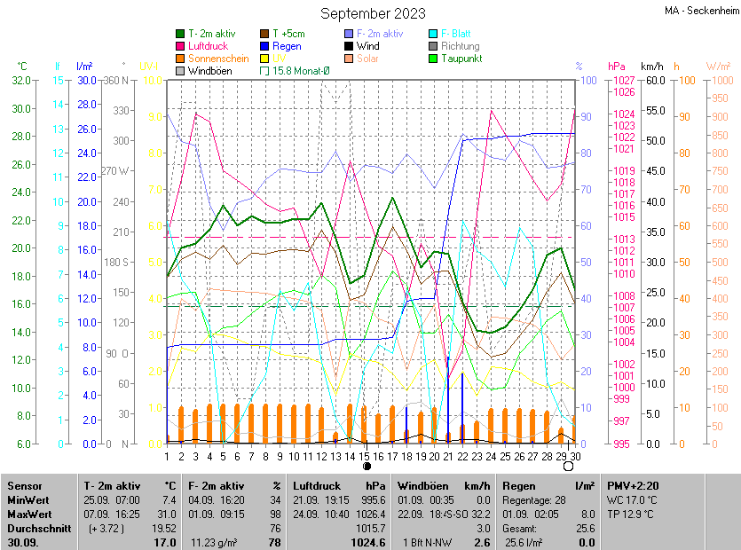 Der wärmste Tag war der 07.09.2023 um 16:25 mit 31.0°C. Am kältesten war es mit 7.4°C am 25.09.2023 um 07:00.