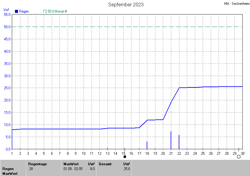 Die gesamte Regenmenge lag bei 25.6l/m² (entspricht: 51.2%) und war damit um -24.4l/m² vom langjährigen Wert entfernt. Niederschlag gab es an 11Tagen. Mehr als 2mm Regen gab es an 4Tagen. Sehr viel Regen mit mehr als 20mm pro Tag gab es an 0Tagen.