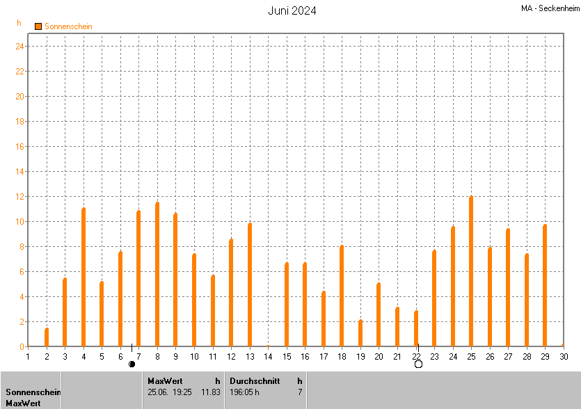 Dargestellt wird die grafische Übersicht für die Sonnenscheinzeit. Zu sehen sind immer die täglichen Sonnenstunden (von 0-24 Uhr):