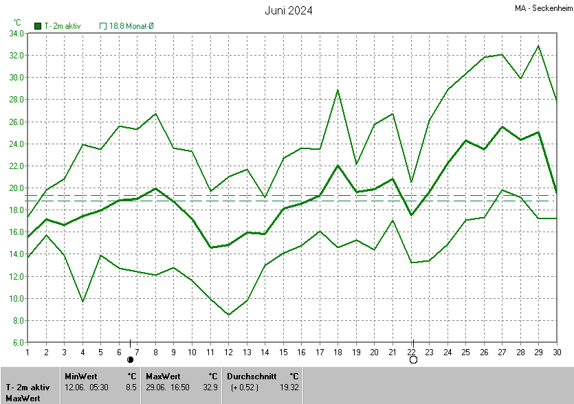 Die Durchschnittstemperatur für den Monat Juni 2024 lag bei 19.34°C. Die Abweichung vom langjährigen Mittel war +0.54°C.