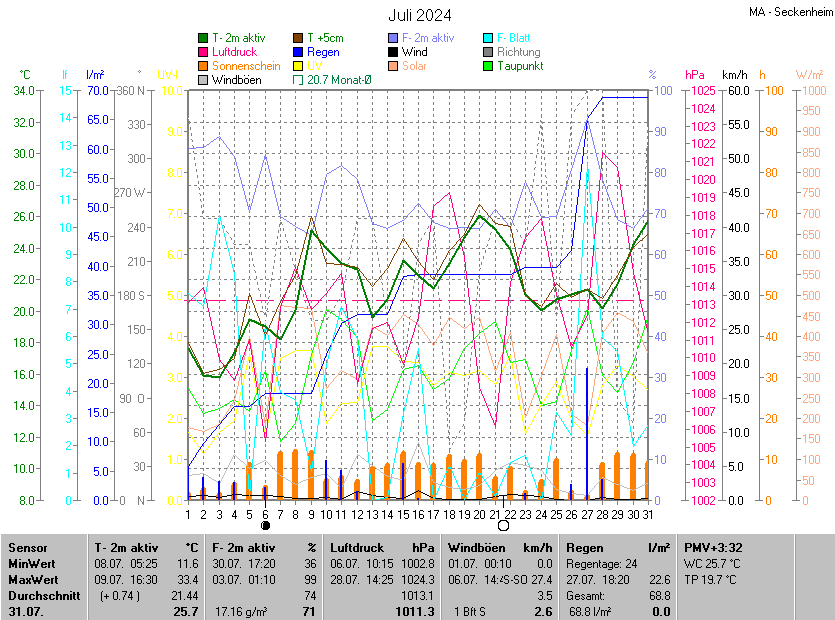 Der wärmste Tag war der 09.07.2024 um 16:30 mit 33.4°C. Am kältesten war es mit 11.6°C am 08.07.2024 um 05:25.