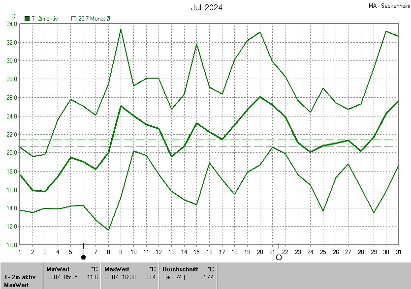 Die Durchschnittstemperatur für den Monat Juli 2024 lag bei 21.42°C. Die Abweichung vom langjährigen Mittel war +0.72°C.