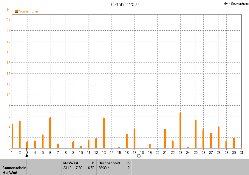 Dargestellt wird die grafische Übersicht für die Sonnenscheinzeit. Zu sehen sind immer die täglichen Sonnenstunden (von 0-24 Uhr):