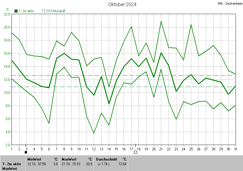 Der wärmste Tag war der 21.10.2024 um 15:10 mit 20.9°C. Am kältesten war es mit 3.8°C am 12.10.2024 um 07:50.