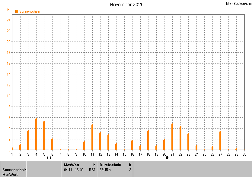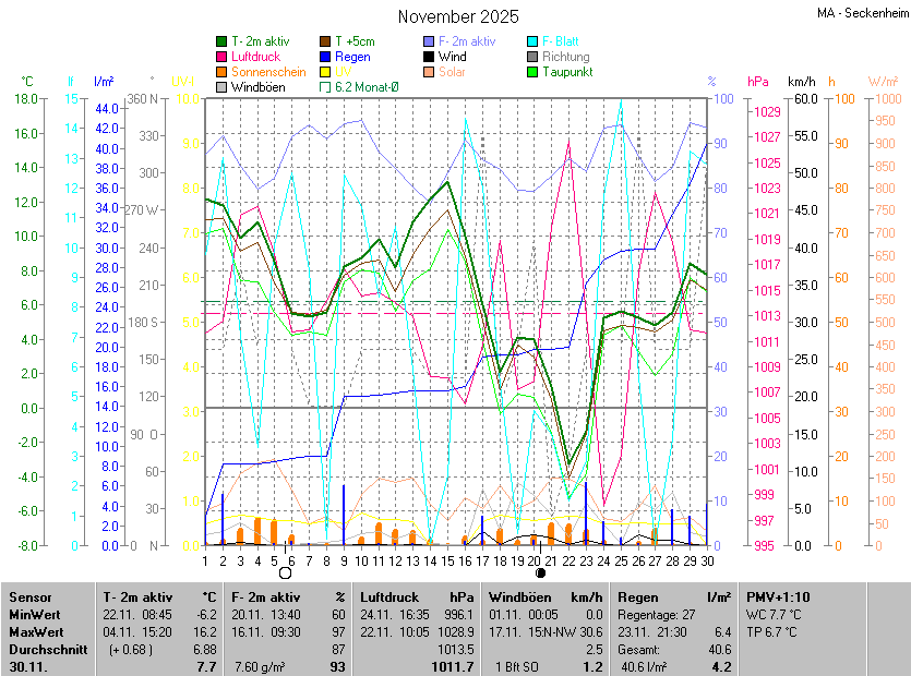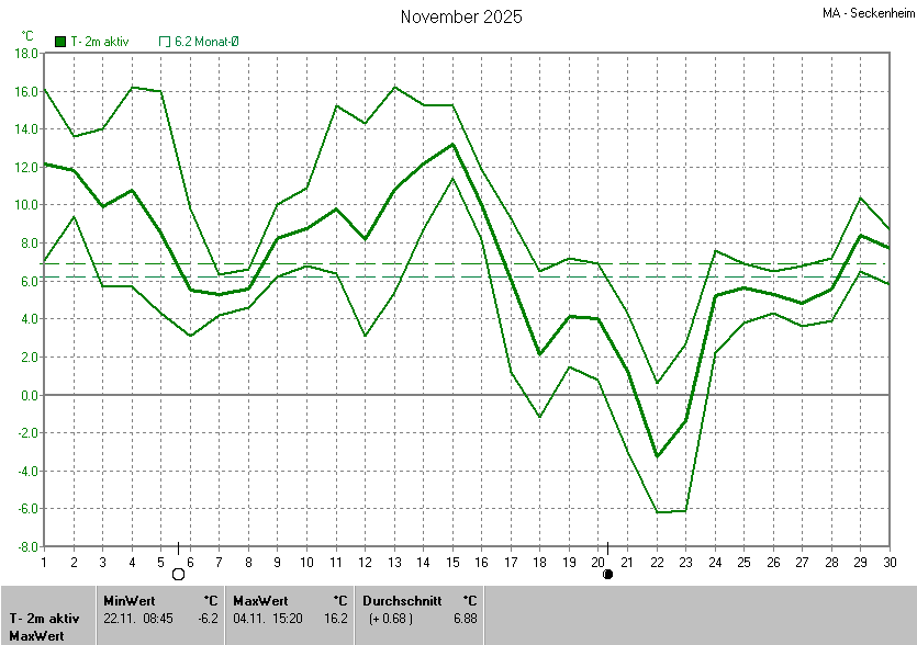 Die Durchschnittstemperatur für den Monat November 2025 lag bei 6.89°C. Die Abweichung vom langjährigen Mittel war +0.69°C.