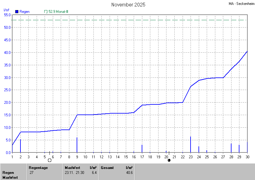 Die gesamte Regenmenge lag bei 40.6l/m² (entspricht: 76.7%) und war damit um -12.3l/m² vom langjährigen Wert entfernt. Niederschlag gab es an 21Tagen. Mehr als 2mm Regen gab es an 9Tagen. Sehr viel Regen mit mehr als 20mm pro Tag gab es an 0Tagen.