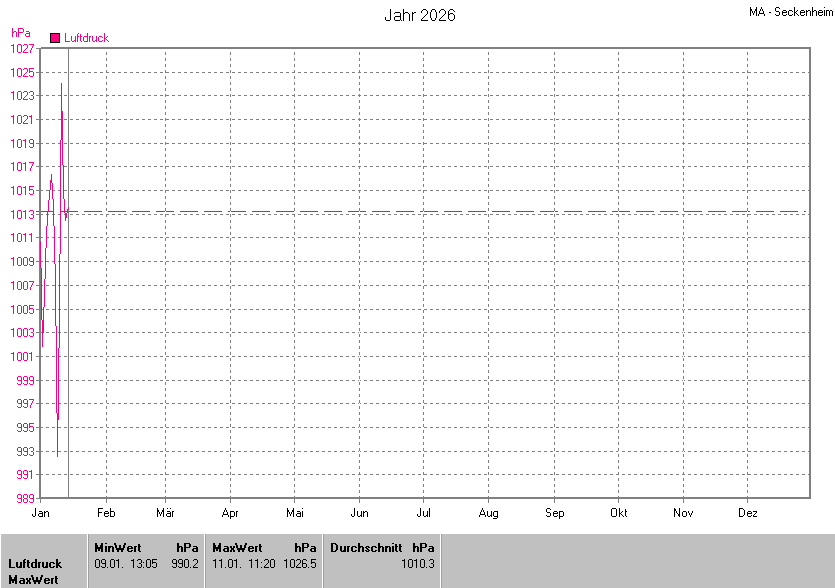 Die Durchschnittstemperatur für das Jahr 2026 lag bei 1.36°C. Die Abweichung vom langjährigen Mittel war -9.84°C.