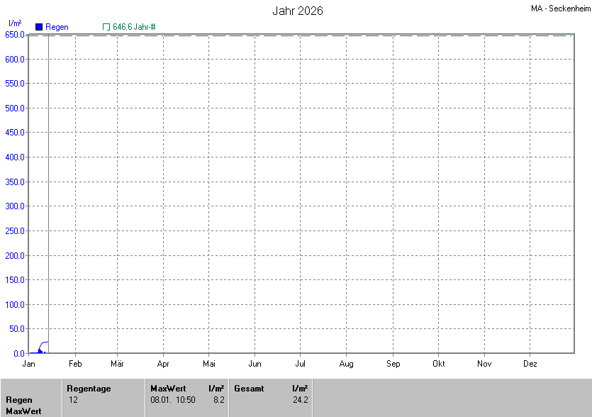 Die gesamte Regenmenge lag bei 24.2l/m² ( 3.7%) und war damit um -622.4l/m² vom langjährigen Wert entfernt. Niederschlag gab es an 8Tagen. Mehr als 2mm Regen gab es an 4Tagen. Sehr viel Regen mit mehr als 20mm pro Tag gab es an 0Tagen.