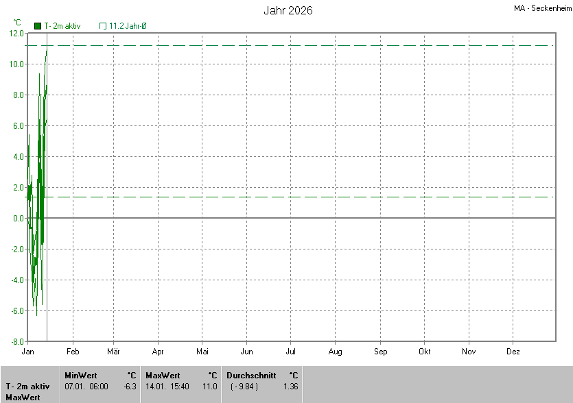Am wärmsten war es am 14.01.2026 um 15:40 mit 11.0°C. Am kältesten mit -6.3°C am 07.01.2026 um 06:00.