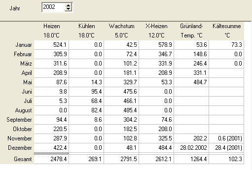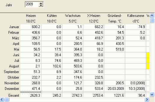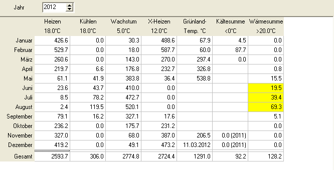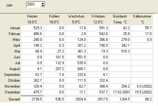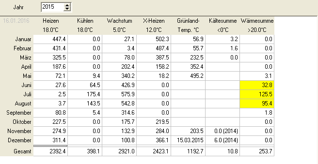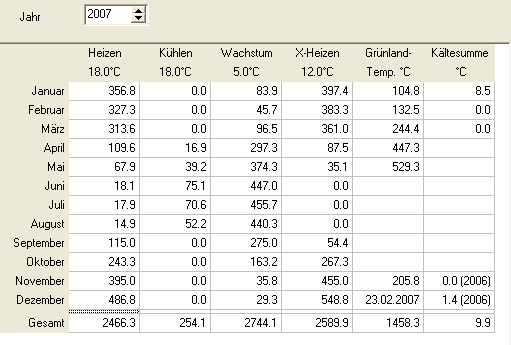 Berechnung: Liegt der Temperatur-Mittelwert des Tages über dem einstellbaren Basiswert (5°C) wird die Differenz vom aktuellen Mittelwert zum Basiswert zu den Wachstumsgradtagen addiert.