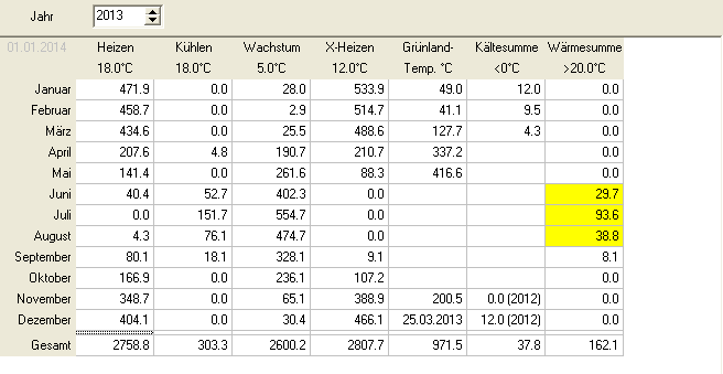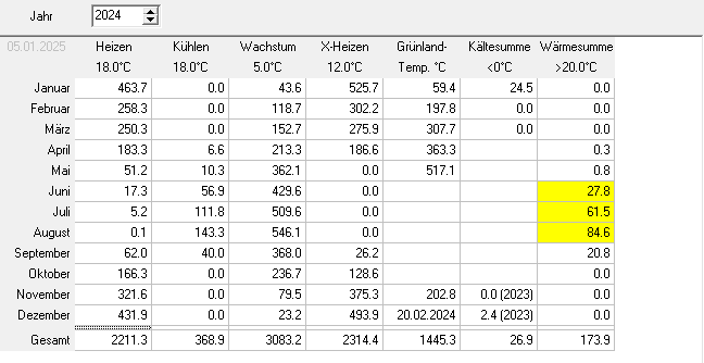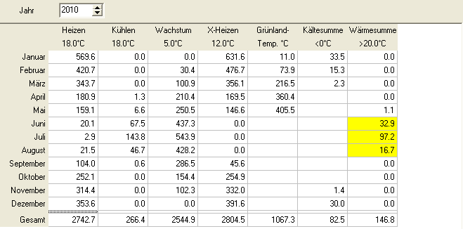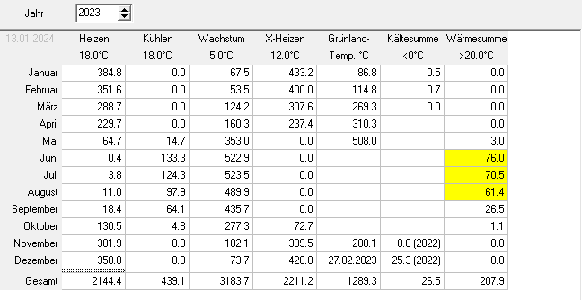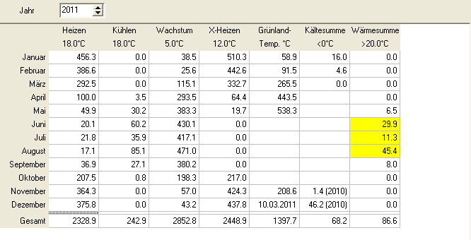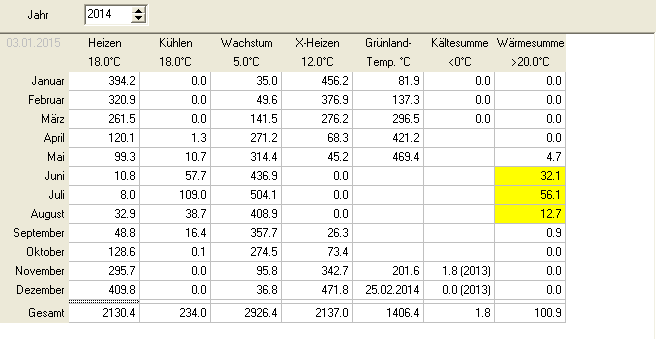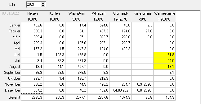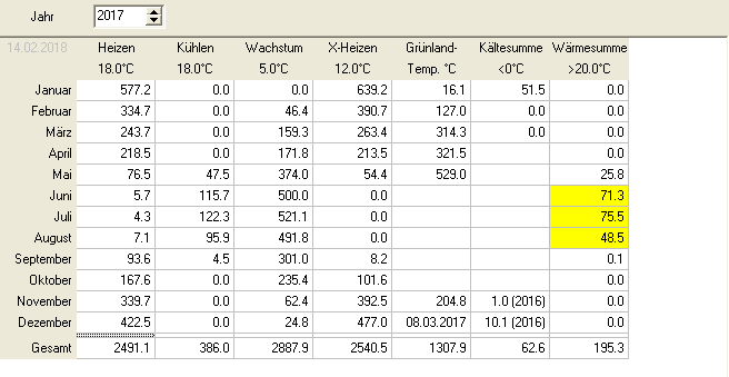 Berechnung: Liegt der Temperatur-Mittelwert des Tages über dem einstellbaren Basiswert (18°C) wird die Differenz vom aktuellen Mittelwert zum Basiswert zu den Kühlengradtagen addiert.