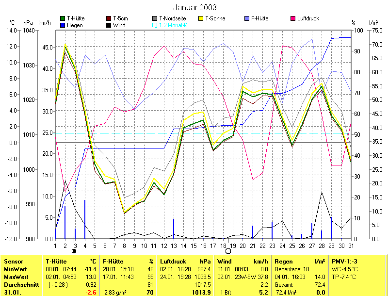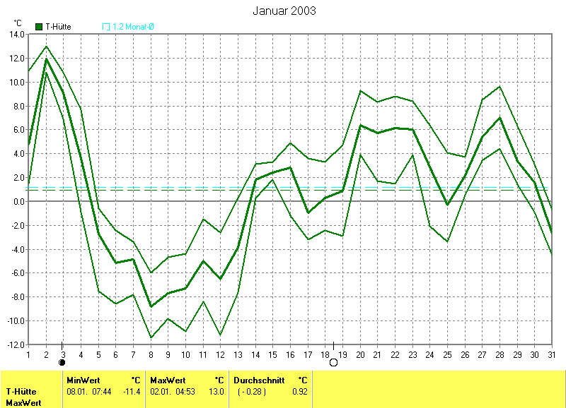 Der wärmste Tag war der 02.01.2003 um 04:53 mit 13.0°C. Am kältesten war es mit -11.4°C am 08.01.2003 um 07:44.