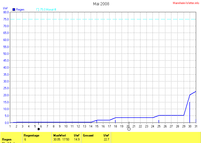 Die gesamte Regenmenge lag bei 22.7l/m² (entspricht: 30.3%) und war damit um -52.3l/m² vom langjährigen Wert entfernt. Niederschlag gab es an 6Tagen. Mehr als 2mm Regen gab es an 2Tagen. Sehr viel Regen mit mehr als 20mm pro Tag gab es an 0Tagen.