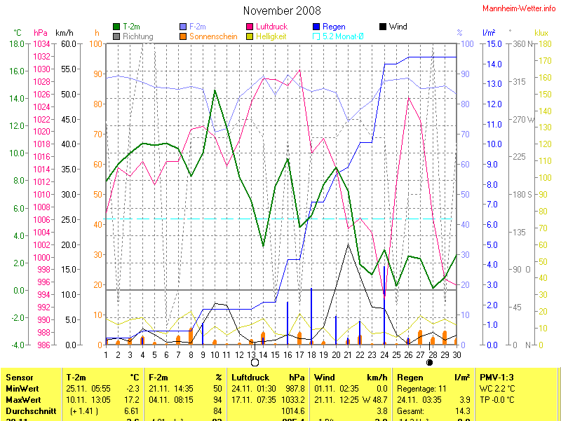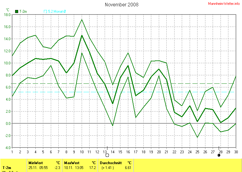 Der wärmste Tag war der 10.11.2008 um 13:05 mit 17.2°C. Am kältesten war es mit -2.3°C am 25.11.2008 um 05:55.