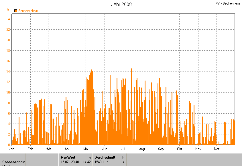 Dargestellt wird die grafische Übersicht für die Sonnenscheinzeit. Zu sehen sind immer die täglichen Zeiten (von 0-24 Uhr):