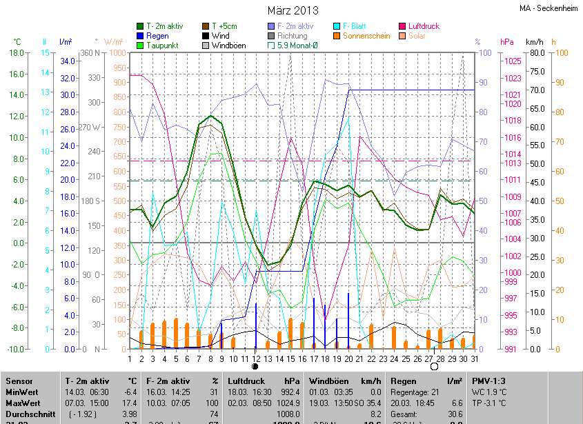 Die Durchschnittstemperatur für den Monat März 2013 lag bei 3.98°C. Die Abweichung vom langjährigen Mittel war -1.92°C.
