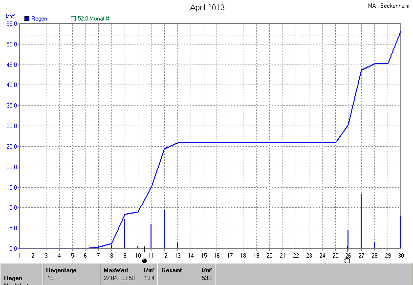 Die Durchschnittstemperatur für den Monat April 2013 lag bei 11.24°C. Die Abweichung vom langjährigen Mittel war +1.34°C.
