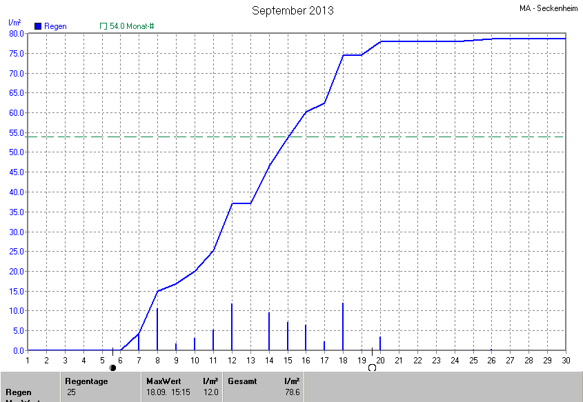 Die gesamte Regenmenge lag bei 78.6l/m² (entspricht: 145.6%) und war damit um +24.6l/m² vom langjährigen Wert entfernt. Niederschlag gab es an 15Tagen. Mehr als 2mm Regen gab es an 11Tagen. Sehr viel Regen mit mehr als 20mm pro Tag gab es an 0Tagen.