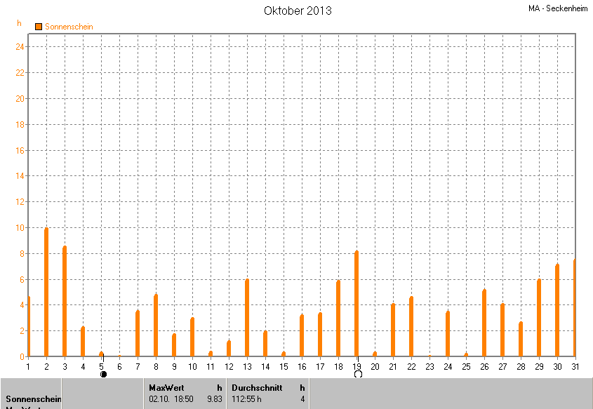 Dargestellt wird die grafische Übersicht für die Sonnenscheinzeit. Zu sehen sind immer die täglichen Sonnenstunden (von 0-24 Uhr):