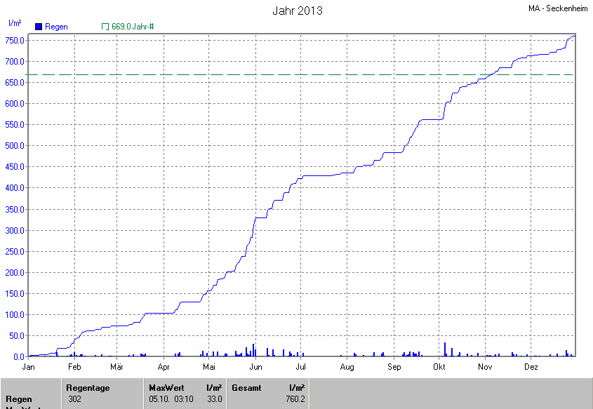 Die gesamte Regenmenge lag bei 760.2l/m² ( 113.6%) und war damit um +91.2l/m² vom langjährigen Wert entfernt. Niederschlag gab es an 183Tagen. Mehr als 2mm Regen gab es an 91Tagen. Sehr viel Regen mit mehr als 20mm pro Tag gab es an 3Tagen.