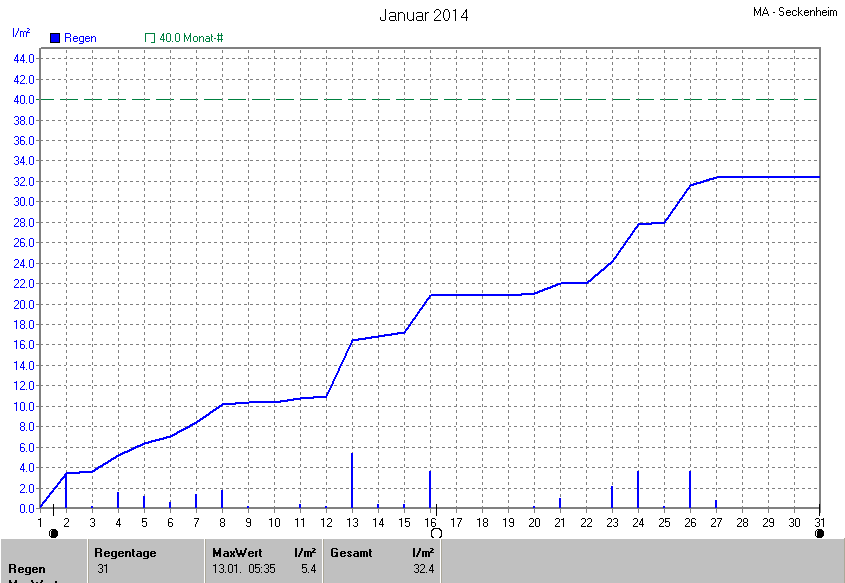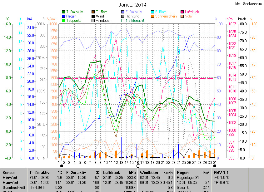 Der wärmste Tag war der 09.01.2014 um 15:00 mit 14.1°C. Am kältesten war es mit -1.6°C am 31.01.2014 um 08:35.