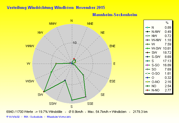 Die Durchschnittstemperatur für den Monat November 2015 lag bei 8.84°C. Die Abweichung vom langjährigen Mittel war +3.64°C.