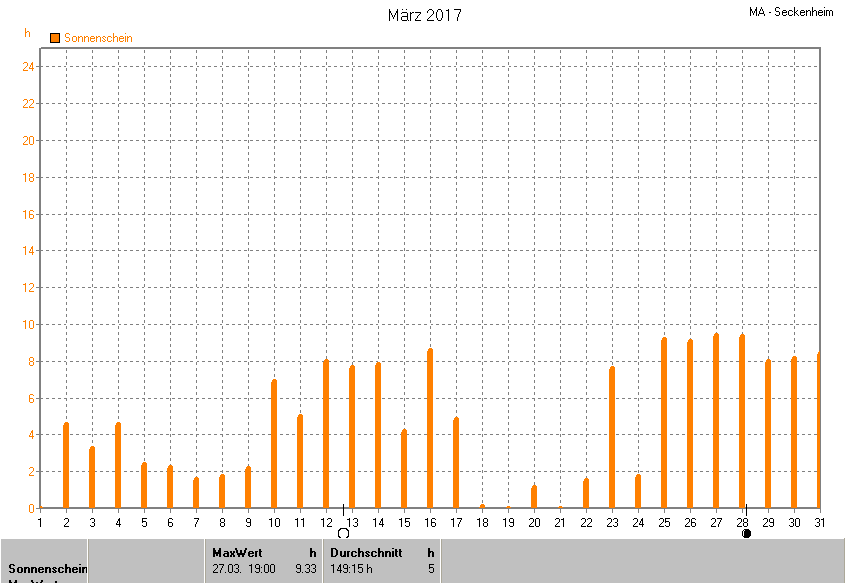 Dargestellt wird die grafische Übersicht für die Sonnenscheinzeit. Zu sehen sind immer die täglichen Sonnenstunden (von 0-24 Uhr):