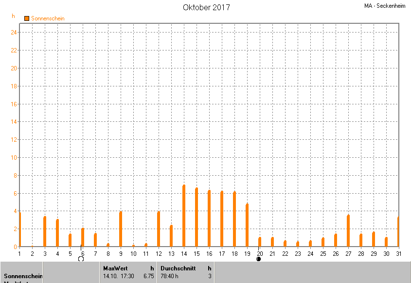Dargestellt wird die grafische Übersicht für die Sonnenscheinzeit. Zu sehen sind immer die täglichen Sonnenstunden (von 0-24 Uhr):