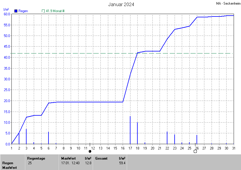 Die gesamte Regenmenge lag bei 59.4l/m² (entspricht: 141.8%) und war damit um +17.5l/m² vom langjährigen Wert entfernt. Niederschlag gab es an 18Tagen. Mehr als 2mm Regen gab es an 8Tagen. Sehr viel Regen mit mehr als 20mm pro Tag gab es an 0Tagen.