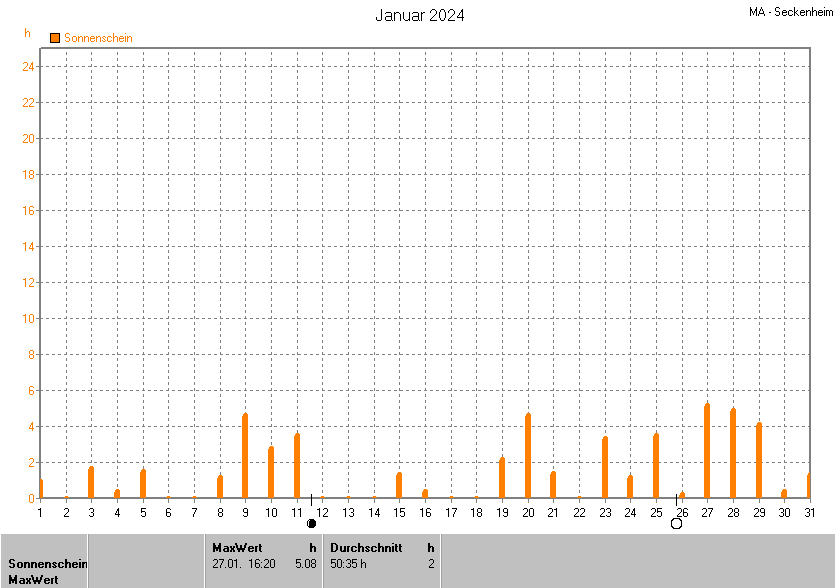 Dargestellt wird die grafische Übersicht für die Sonnenscheinzeit. Zu sehen sind immer die täglichen Sonnenstunden (von 0-24 Uhr):